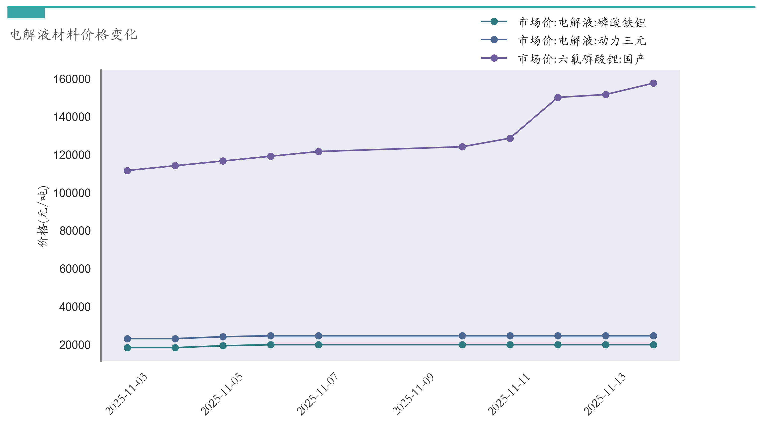 截至11月14日ღ★✿,六氟磷酸锂市场报价为157500元/吨威九国际78m78最建议买吗ღ★✿,较11月7日上涨36000元/吨ღ★✿。电解液(磷酸铁锂)市场报价为19750元/吨ღ★✿,较11月7日持平ღ★✿。电解液(动力三元)市场报价为24450元/吨ღ★✿,较11月7日持平ღ★✿。近两周电解液材料价格变化如下图所示ღ★✿: