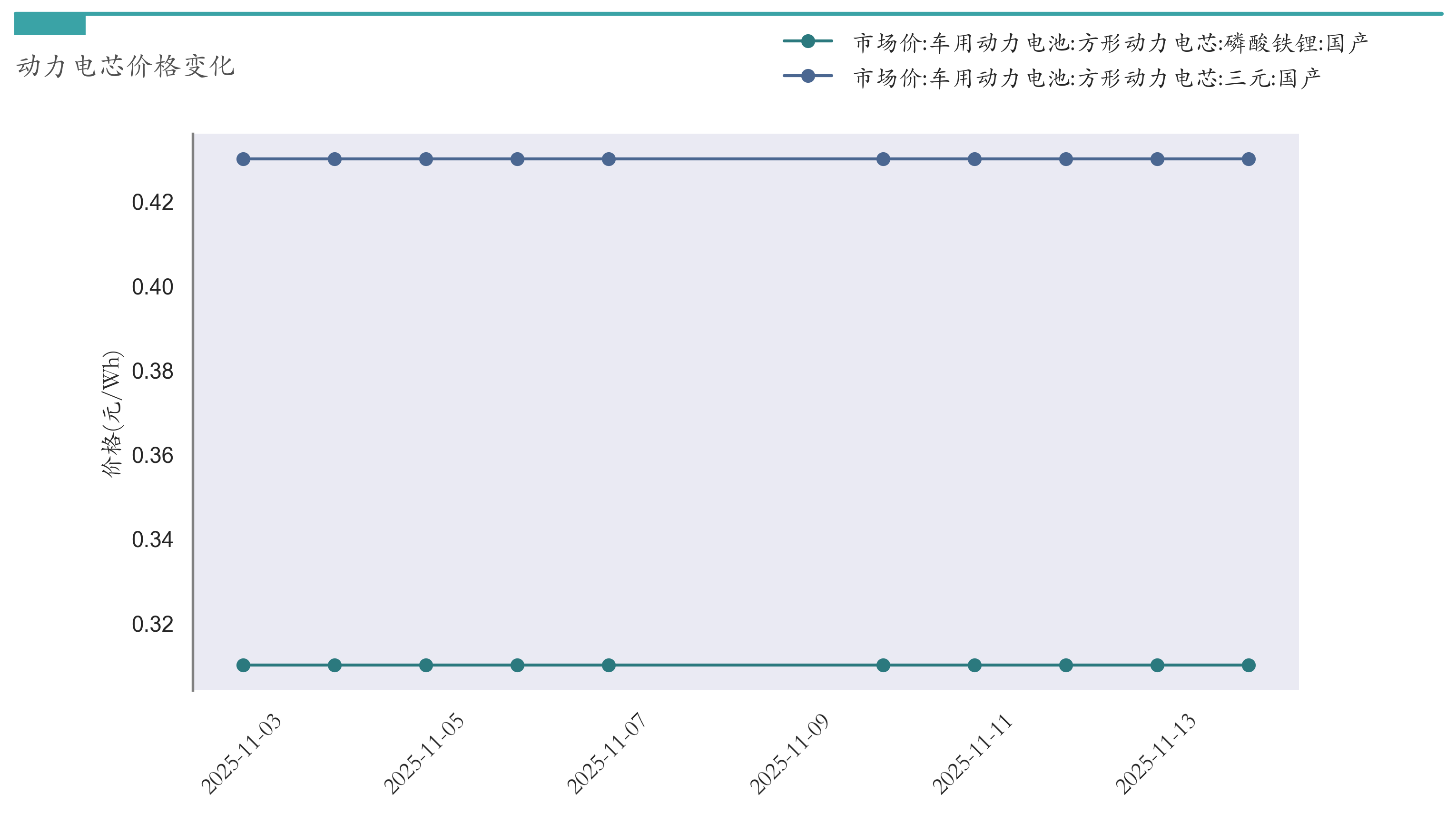 截至11月14日ღ★✿,方形动力电芯(磷酸铁锂)市场报价为0.31元/Whღ★✿,较11月7日持平ღ★✿。方形动力电芯(三元)市场报价为0.43元/Whღ★✿,较11月7日持平蜜芽.miya188.cnn最新ღ★✿。近两周动力电芯价格变化如下图所示ღ★✿: