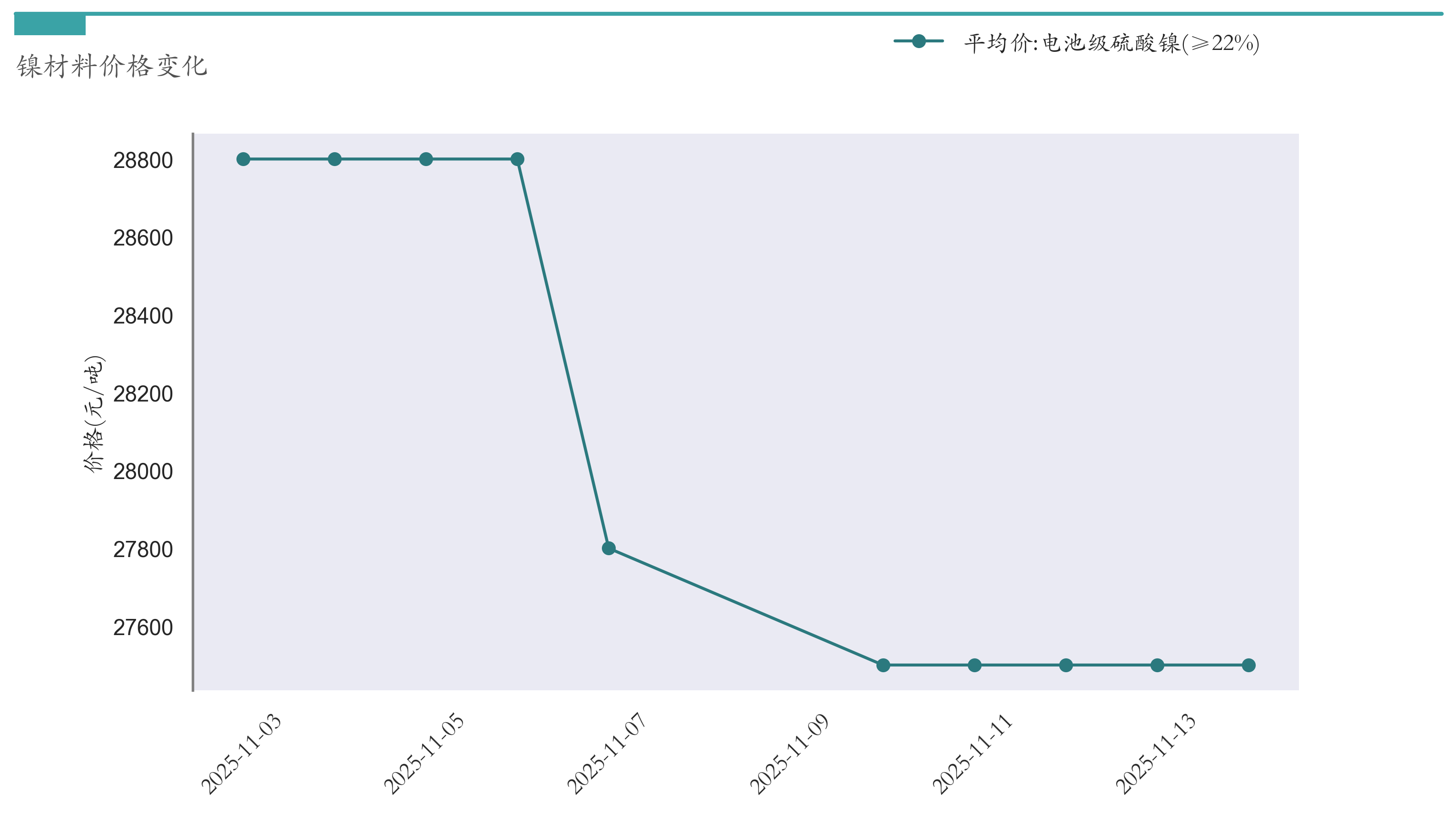 截至11月14日威九国际78m78最建议买吗ღ★✿,电池级硫酸镍平均报价为27500元/吨ღ★✿,较11月7日下跌300元/吨ღ★✿。近两周镍材料价格变化如下图所示ღ★✿: