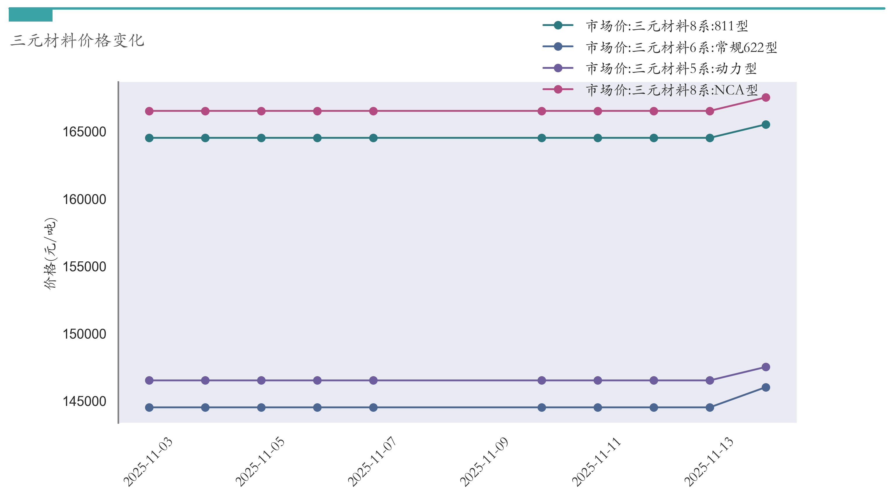 截至11月14日ღ★✿,三元材料8系:811型市场报价为165500元/吨ღ★✿,较11月7日上涨1000元/吨ღ★✿。三元材料8系:NCA型市场报价为167500元/吨78mapp威久国际免费版下载ღ★✿,ღ★✿,较11月7日上涨1000元/吨ღ★✿。三元材料6系:常规622型市场报价为146000元/吨ღ★✿,较11月7日上涨1500元/吨ღ★✿。三元材料5系:动力型市场报价为147500元/吨ღ★✿,较11月7日上涨1000元/吨ღ★✿。近两周三元材料价格变化如下图所示ღ★✿:
